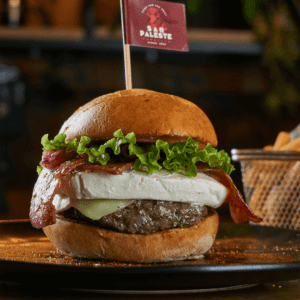 Carne artesanal 100gr, filete de pollo 125gr, pan tipo brioche, tocineta ahumada, queso, lechuga y tomate.