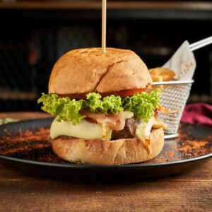 Carne elaborada de 180gr, queso cheddar, pan tipo brioche, tocineta ahumada, queso, lechuga y tomate.