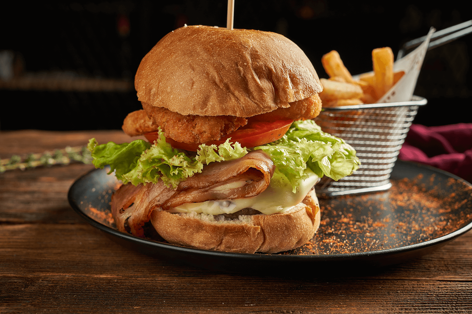 Carne artesanal de 180gr, pan tipo brioche, tocineta ahumada, queso, 3 aros de cebolla, lechuga y tomate.