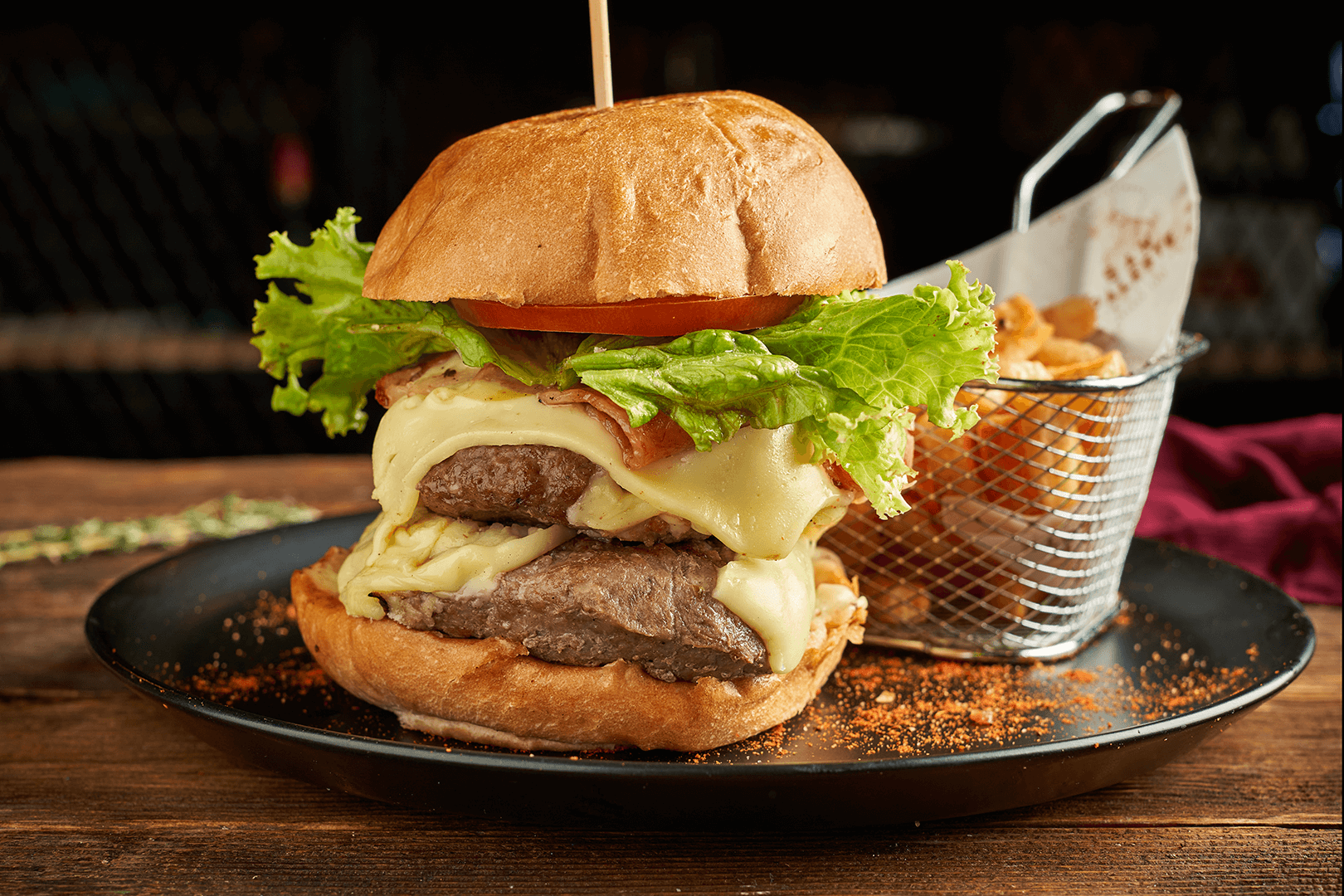 2 Carnes elaboradas de 150gr, pan tipo brioche, tocineta ahumada, queso, lechuga y tomate.