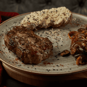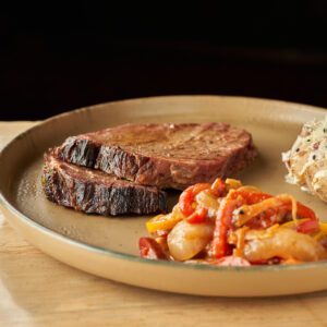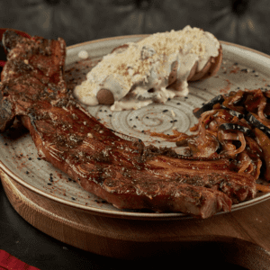 Maduracion de carnes de 30 dias y posterior Cocción lenta en ahumador durante 12 horas, acompañado de vegetales salteados y puré de la casa.