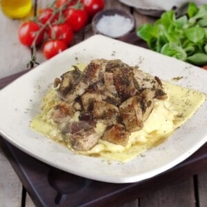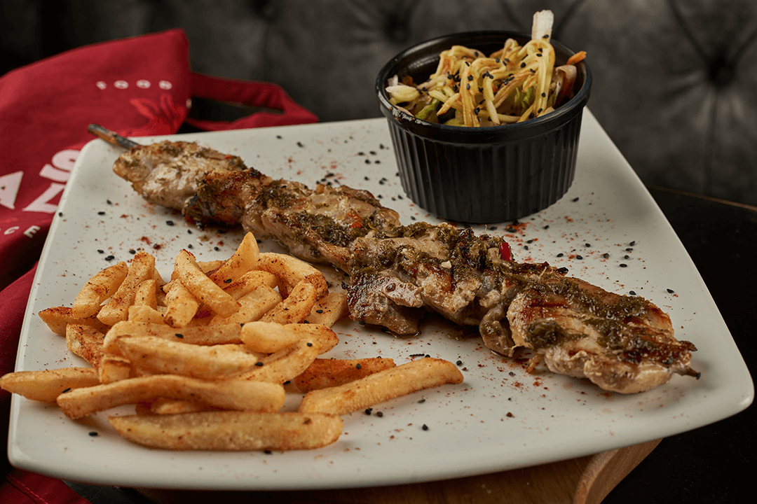 Chuzo de pollo o de cerdo, maicitos, queso doble crema, rio de papas, salsa de la casa.