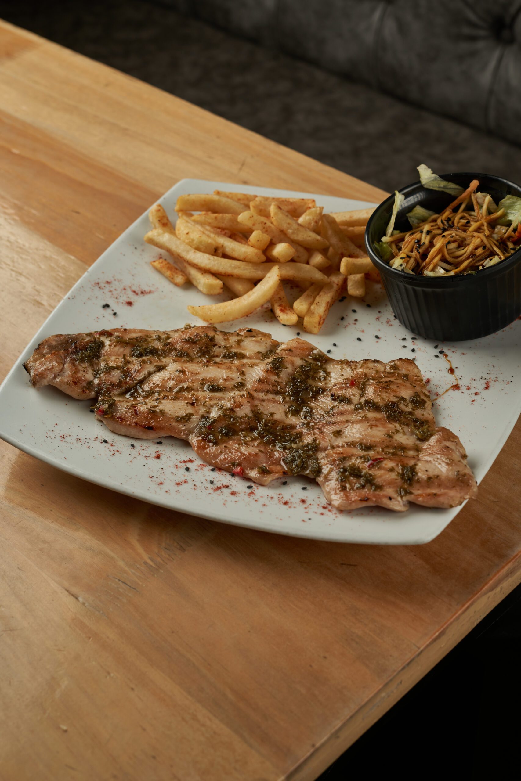 Acompañado de papa a la francesa, papa rusticas o papas al vapor, con ensalada del día.