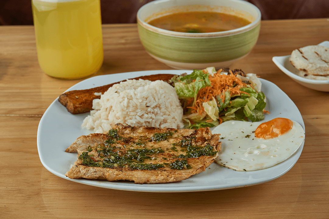 Elegiste: Deliciosa trucha a la plancha, acompañada de consomé de pezcado, arroz con coco, patacones, ensalada y bebida.