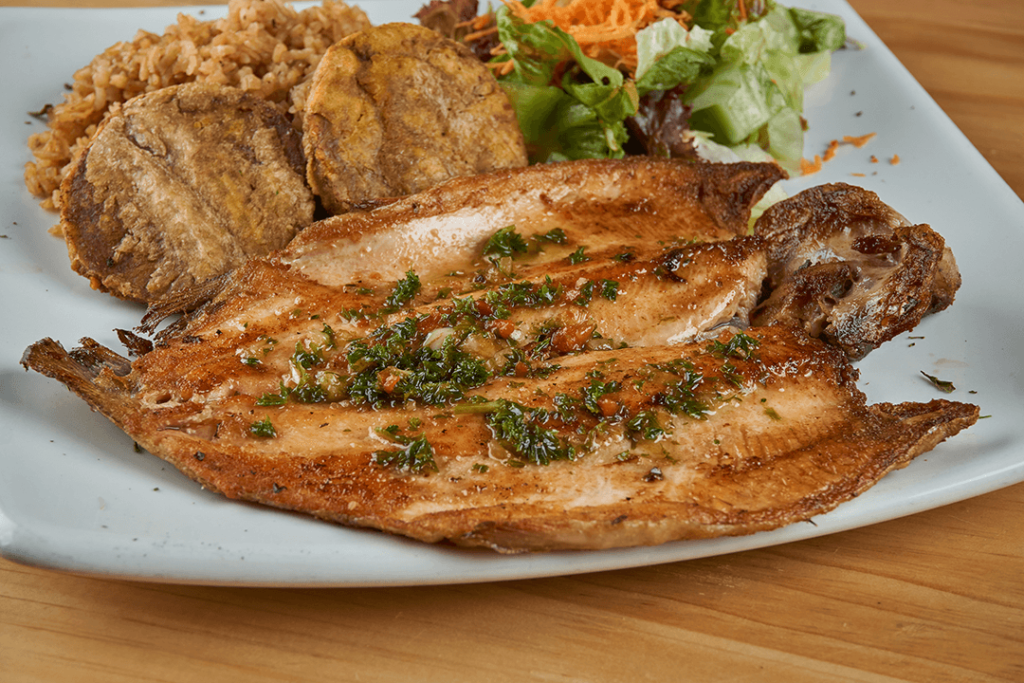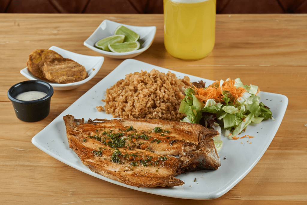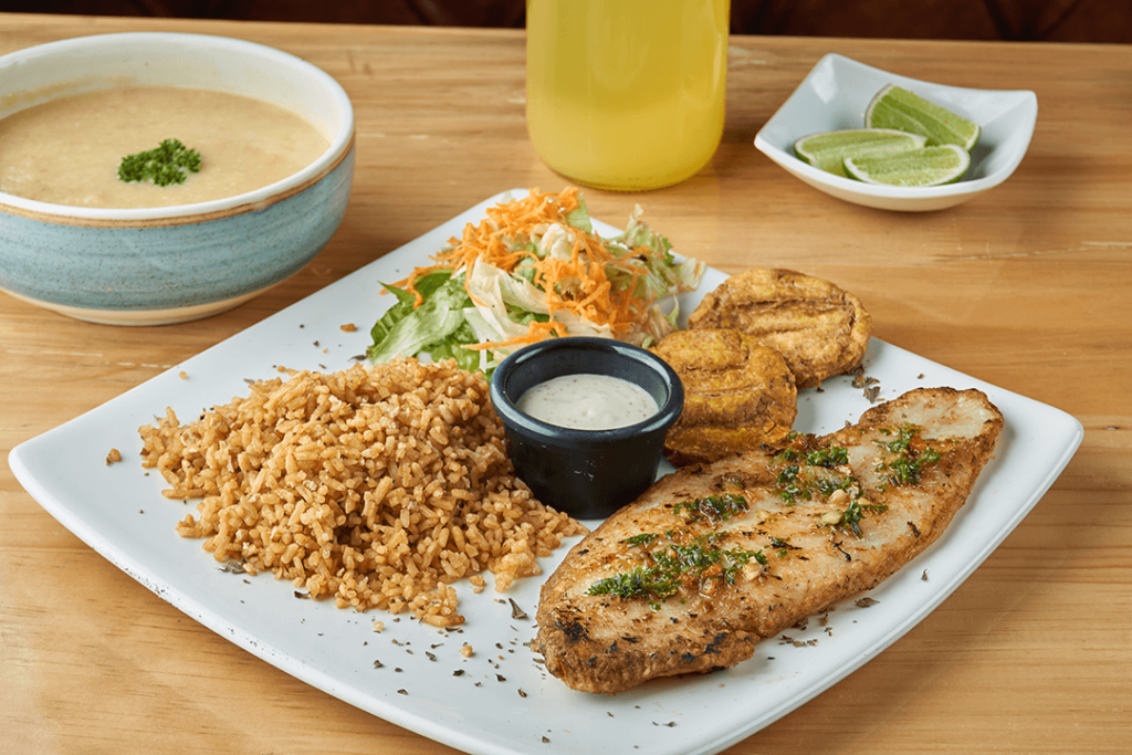 Elegiste: Disfruta a tu elección de róbalo o trucha gratinada con queso mozzarella y parmesano, acompañada de consomé de pezcado, arroz con coco, patacones, ensalada y bebida.