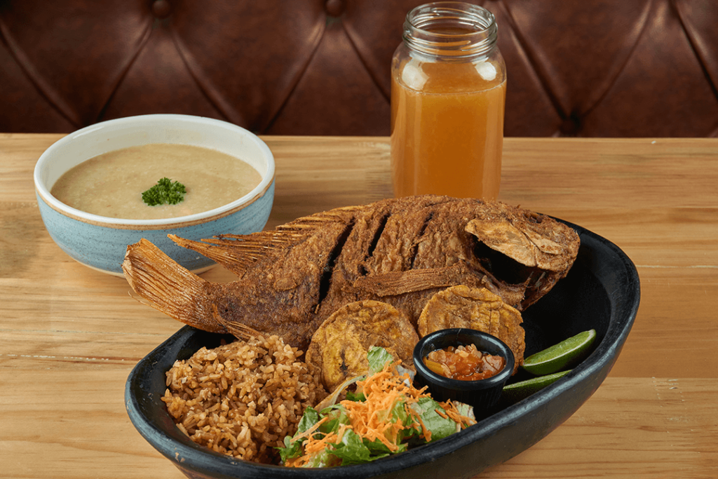 Elegiste: Deliciosa tilapia frita, acompañada de consomé de pezcado, arroz con coco, patacones, ensalada y bebida.