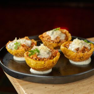 Carne a la bolognesa, frijol refrito, sour cream, pico de gallo, guacamole.