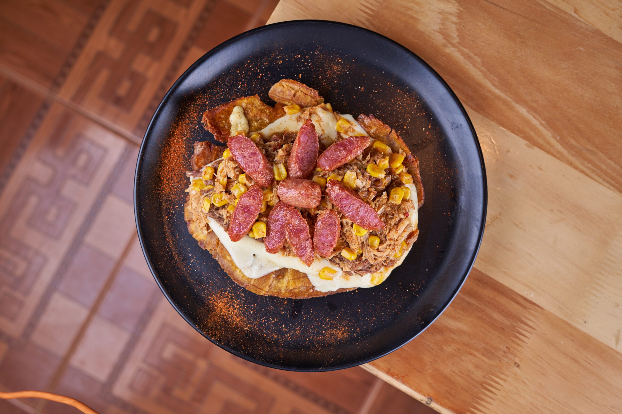 Carne desmechada, maicitos, salchicha ranchera, queso y guacamole.