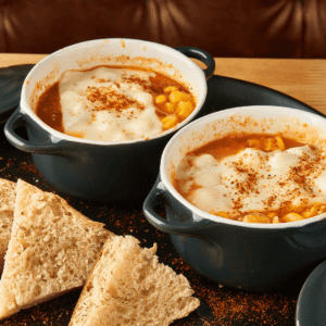 Con jamón y queso, acompañadas de mermelada de frutos rojos y miel de maple. Incluye café, café con leche o chocolate.