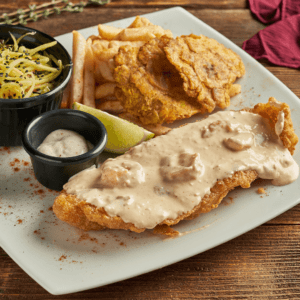 Acopañada de patacón, papas a la francesa y ensalada